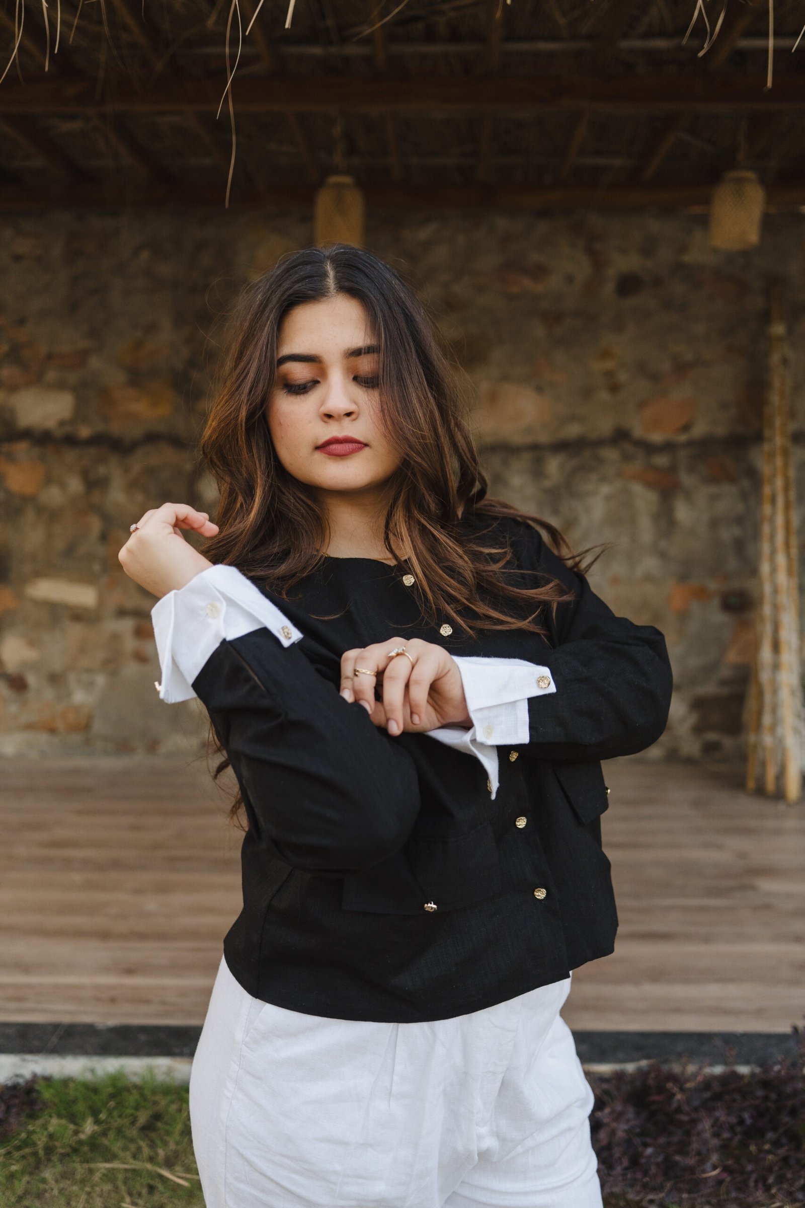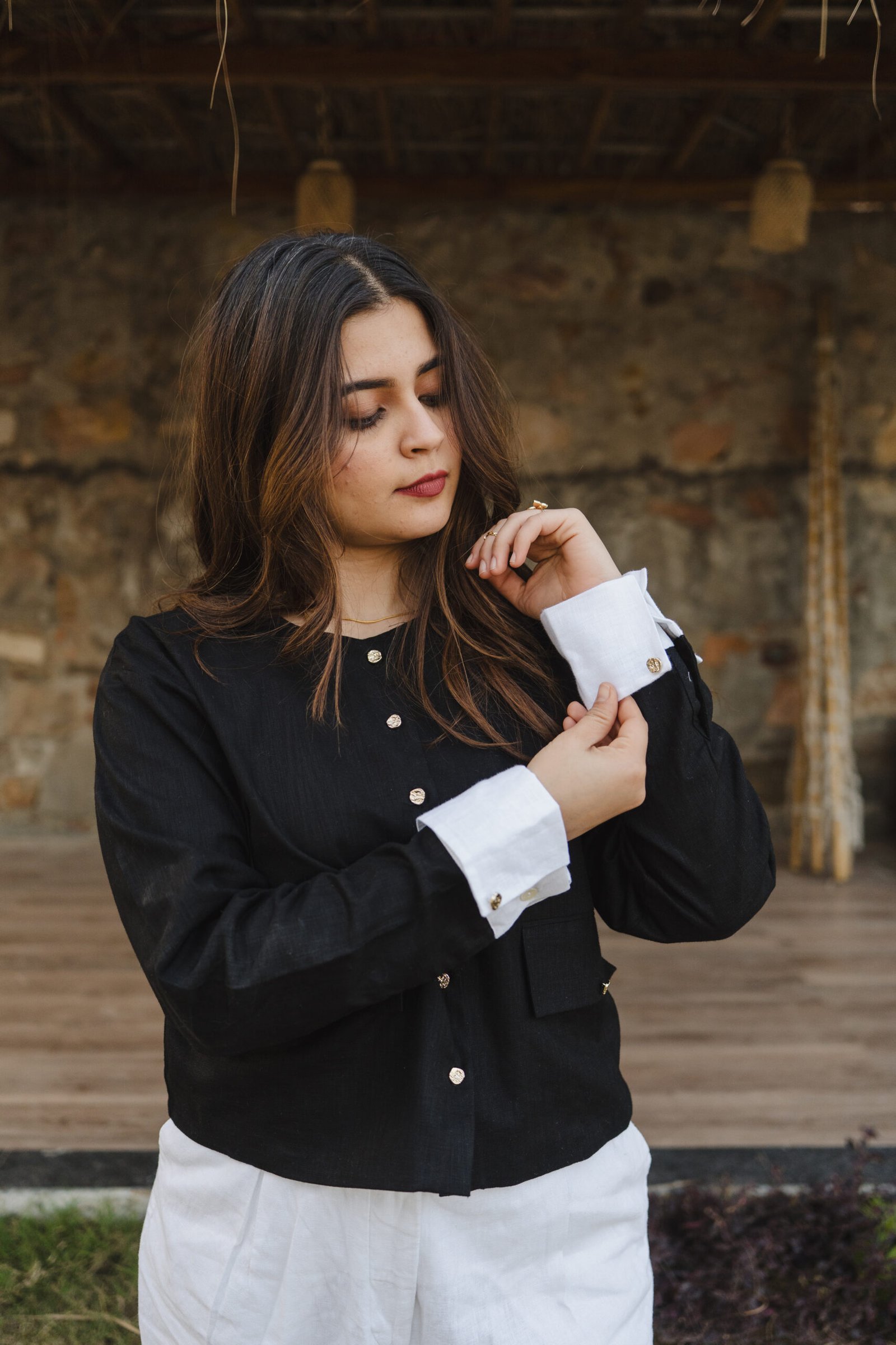 Sharp Contrast. Soft Power : Where structure meets air, this black linen full-sleeve shirt delivers effortless authority with all-day comfort. Crafted from breathable linen and finished with smooth Centoon fabric detailing, it feels light, fluid and refined against the skin. Thoughtfully designed front pockets add relaxed practicality, while artistic seamless stitching keeps the silhouette clean and elevated. The crisp white cuffs create a striking contrast, and the metallic buttons catch light subtly — like quiet jewellery woven into the garment. Minimal yet expressive, it moves easily from coffee runs to work hours to evening plans without losing its calm presence.
