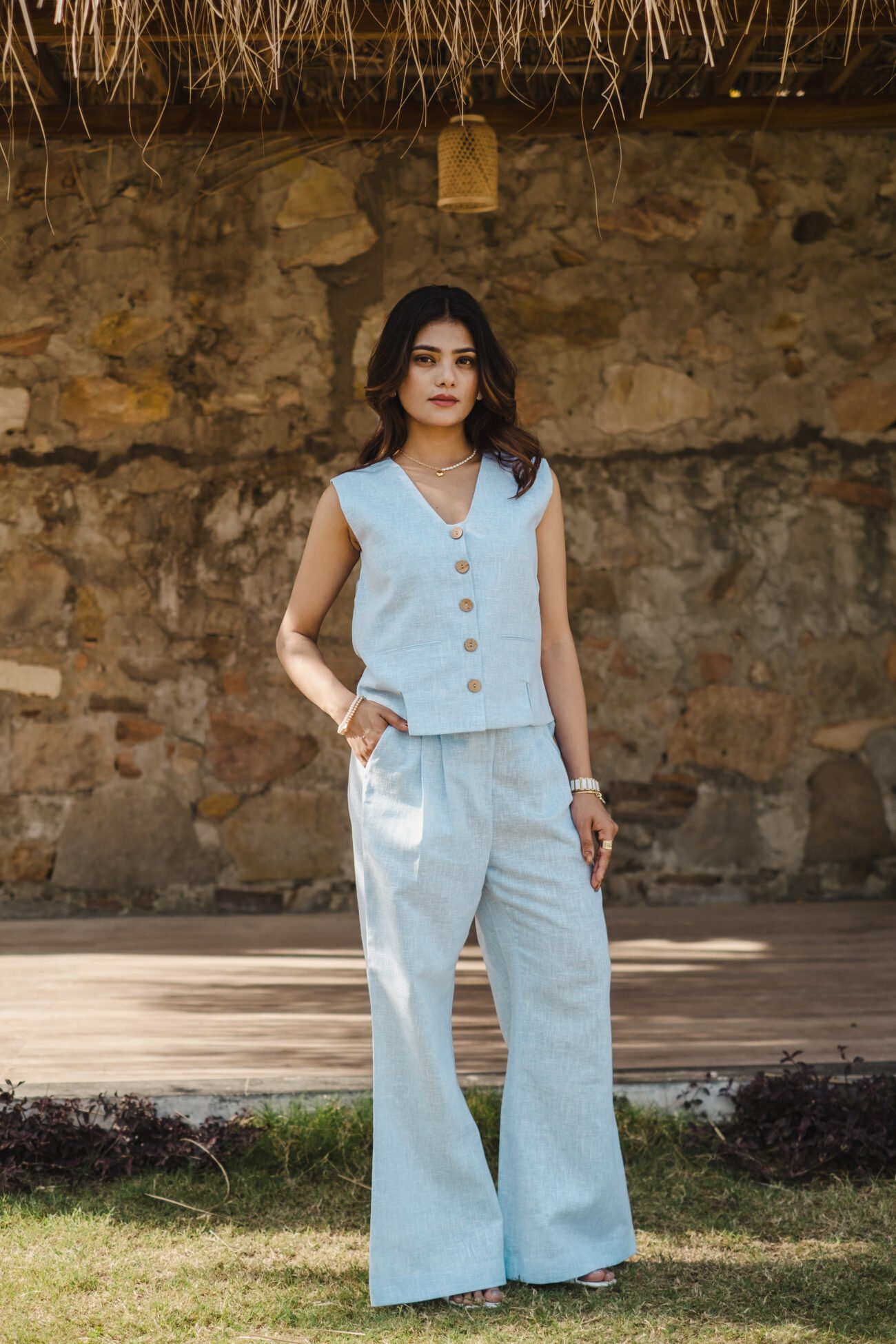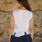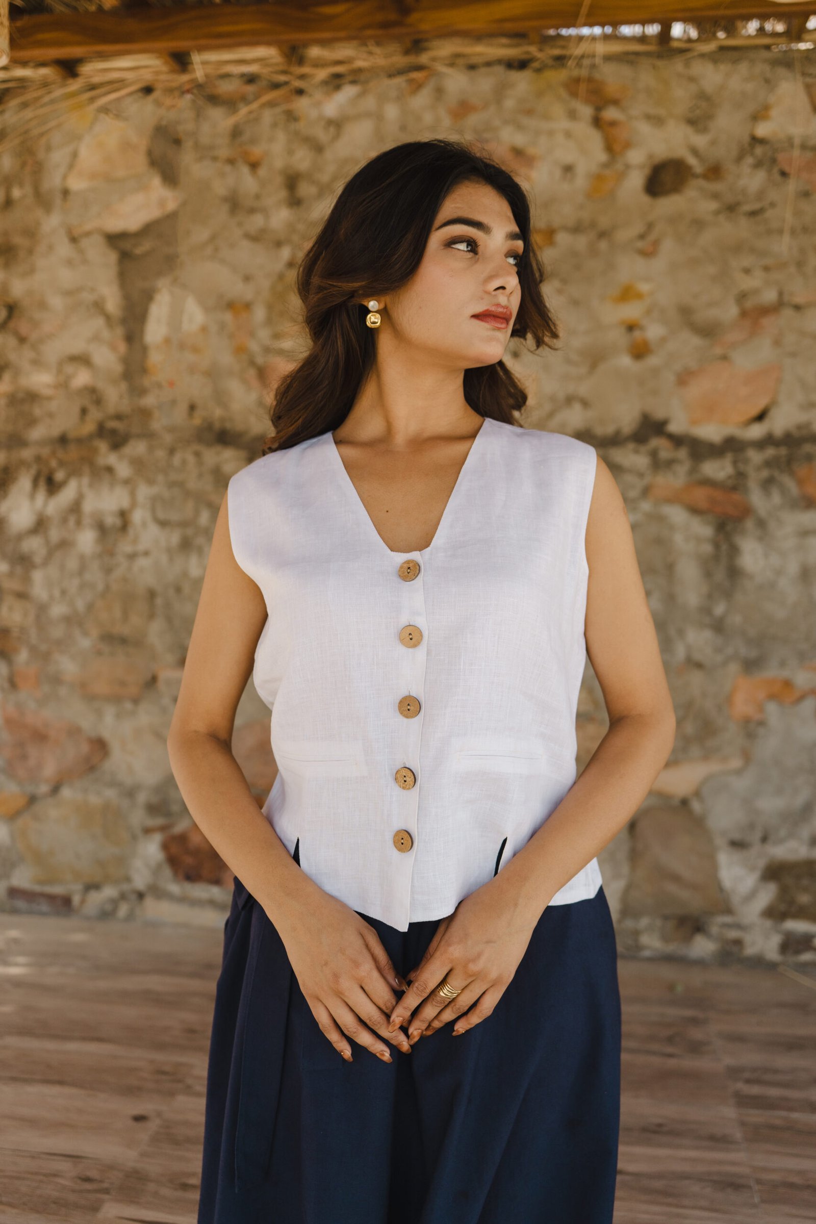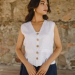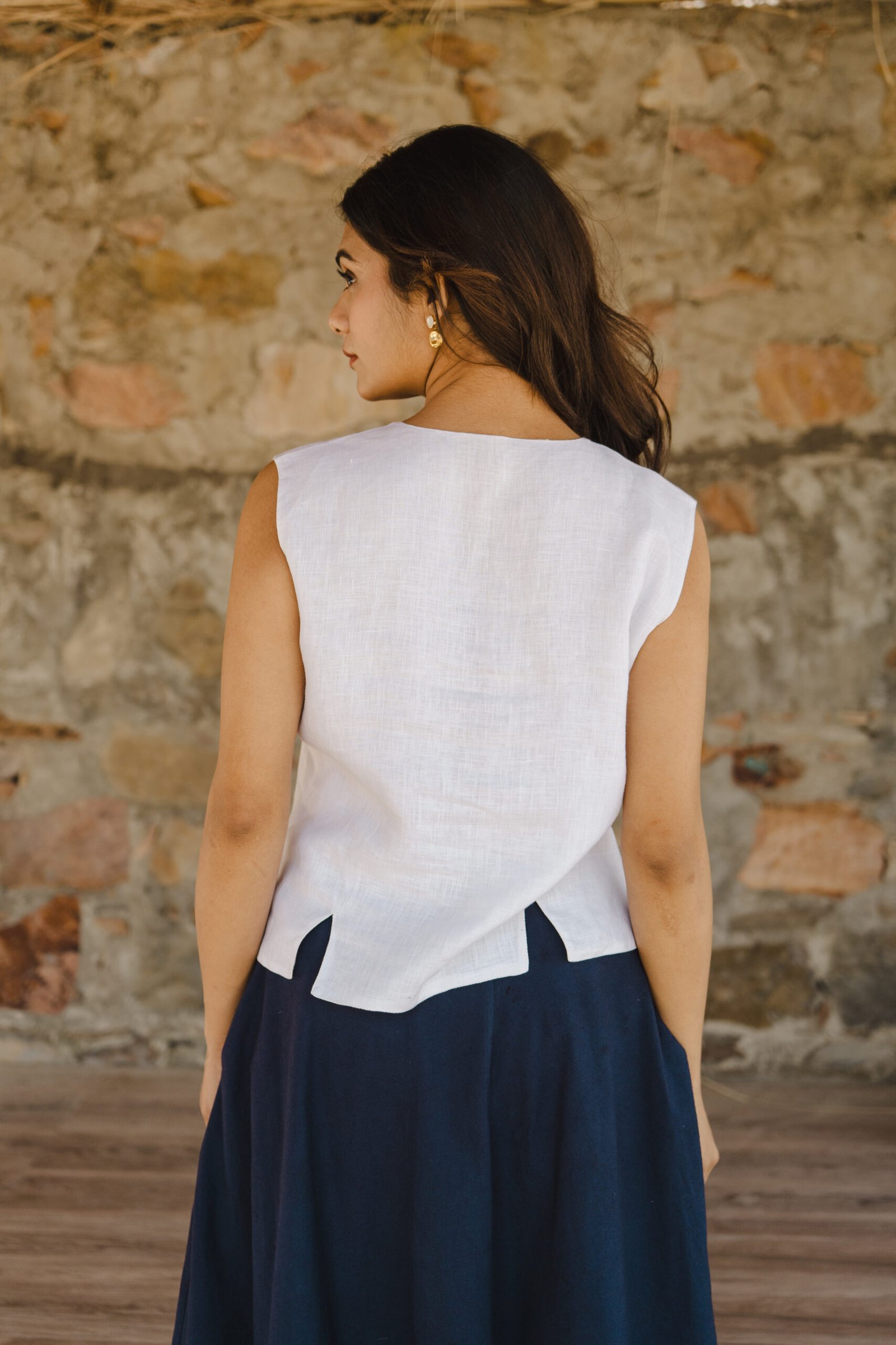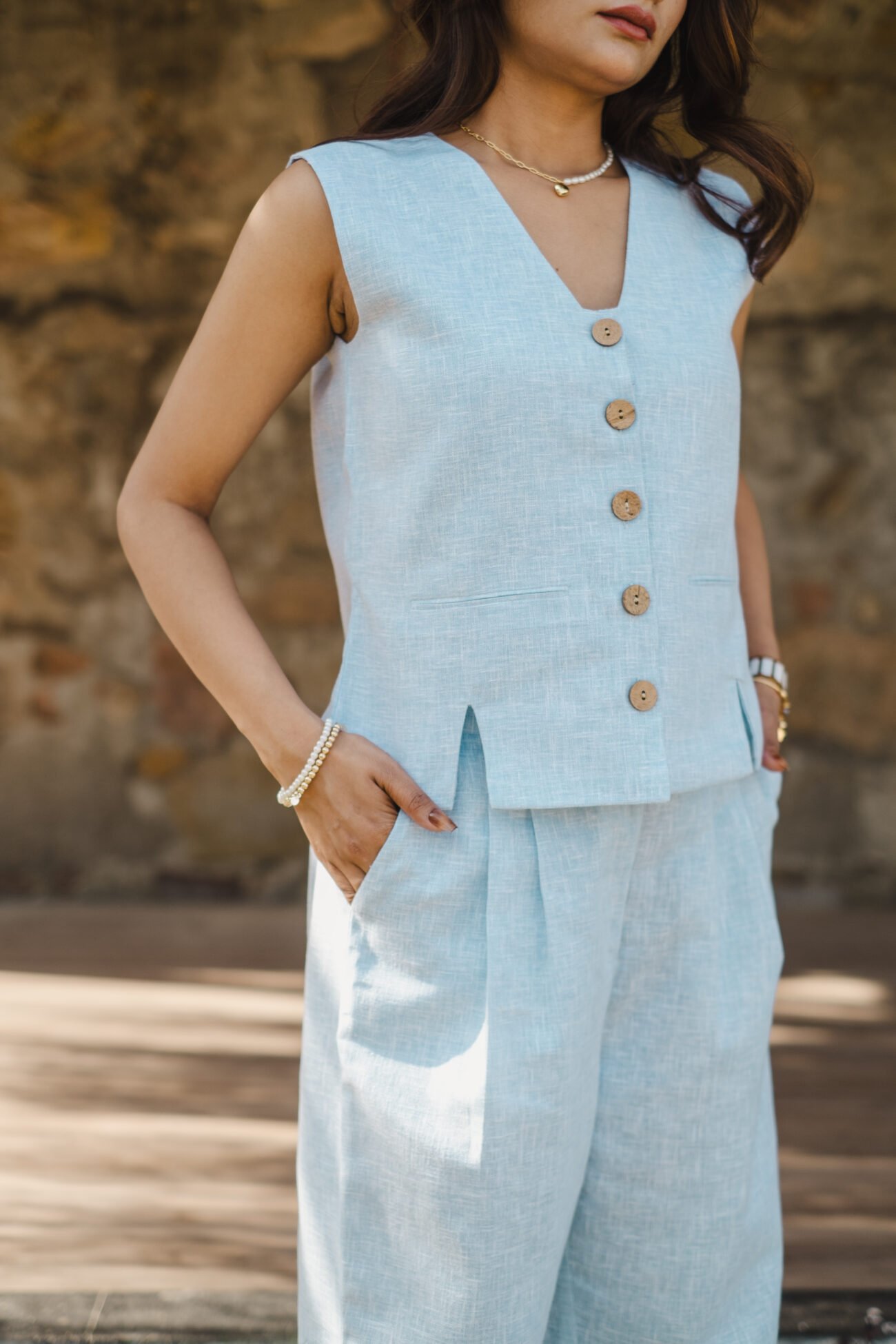 Pattern: Solid linen waistcoat with front and back slit detail